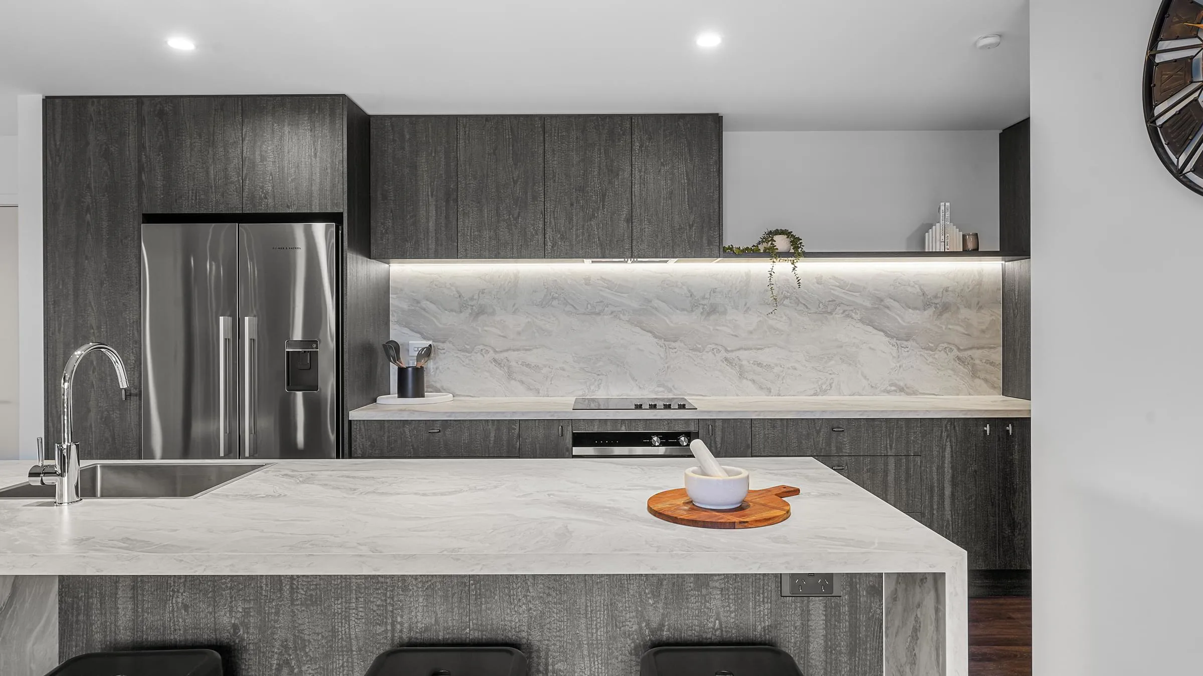 The clever mix of exterior claddings, innovative features, and styling, such as raking ceilings, the latest interior feature walls, and T&G board linings, creates a variety of finishes inside the home. A beautifully designed modern kitchen with built-in joinery fixtures adds to its appeal.